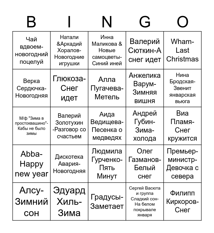 This bingo card has 25 words: Дискотека Авария-Новогодняя, Градусы-Заметает, Алла Пугачева-Метель, Алсу-Зимний сон, Wham-Last Christmas, Чай вдвоем-новогодний поцелуй, Верка Сердючка- Новогодняя, Натали &Аркадий Хоралов-Новогодние игрушки, Андрей Губин-Зима-холода, Людмила Гурченко-Пять Минут, Анжелика Варум-Зимняя вишня, М/ф "Зима в простоквашино"-Кабы не было зимы, Олег Газманов-Белый снег, Премьер-министр-Девочка с севера, Глюкоза-Снег идет, Филипп Киркоров-Снег, Виа Пламя-Снег кружится, Инна Маликова & Новые самоцветы-Синий иней, Нина Бродская-Звенит январская вьюга, Валерий Золотухин -Разговор со счастьем, Аида Ведищева-Песенка о медведях, Эдуард Хиль-Зима, Abba-Happy new year, Валерий Сюткин-А снег идет and Сергей Васюта и группа Сладкий сон-На белом покрывале января.