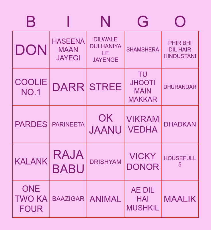 This bingo card has 25 words: RAJA BABU, ANIMAL, STREE, ONE TWO KA FOUR, PHIR BHI DIL HAIR HINDUSTANI, DON, COOLIE NO.1, HASEENA MAAN JAYEGI, VIKRAM VEDHA, DRISHYAM, TU JHOOTI MAIN MAKKAR, PARDES, VICKY DONOR, HOUSEFULL 5, DARR, MAALIK, DHADKAN, DILWALE DULHANIYA LE JAYENGE, DHURANDAR, PARINEETA, OK JAANU, BAAZIGAR, KALANK, SHAMSHERA and AE DIL HAI MUSHKIL.