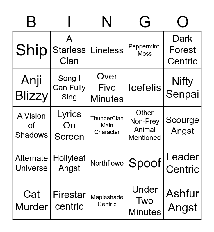 This bingo card has a free space and 24 words: Hollyleaf Angst, Firestar centric, Over Five Minutes, Cat Murder, Dark Forest Centric, Ship, Anji Blizzy, A Starless Clan, Other Non-Prey Animal Mentioned, Northflowo, Icefelis, A Vision of Shadows, Spoof, Leader Centric, Song I Can Fully Sing, Under Two Minutes, Scourge Angst, Lineless, Nifty Senpai, Lyrics On Screen, Ashfur Angst, Alternate Universe, Peppermint-Moss and Mapleshade Centric.