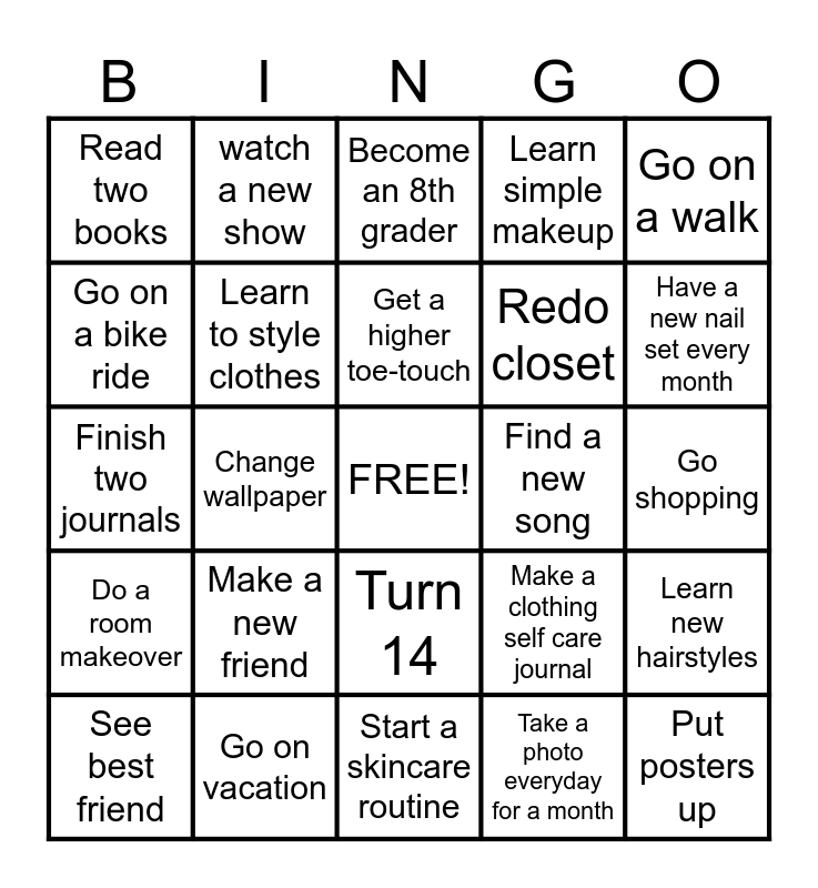 This bingo card has a free space and 24 words: Make a new friend, Go on vacation, Get a higher toe-touch, See best friend, Go on a walk, Read two books, Go on a bike ride, watch a new show, Find a new song, Turn 14, Redo closet, Finish two journals, Make a clothing self care journal, Learn new hairstyles, Learn to style clothes, Take a photo everyday for a month, Go shopping, Become an 8th grader, Have a new nail set every month, Change wallpaper, Put posters up, Do a room makeover, Learn simple makeup and Start a skincare routine.