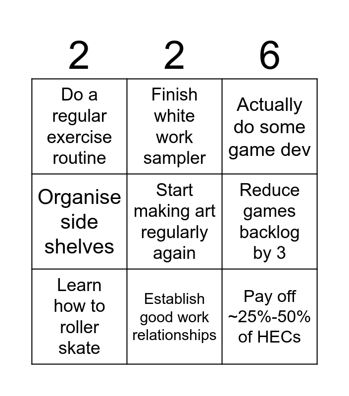 This bingo card has a free space and 8 words: Reduce games backlog by 3, Actually do some game dev, Finish white work sampler, Learn how to roller skate, Do a regular exercise routine, Pay off ~25%-50% of HECs, Organise side shelves and Establish good work relationships.