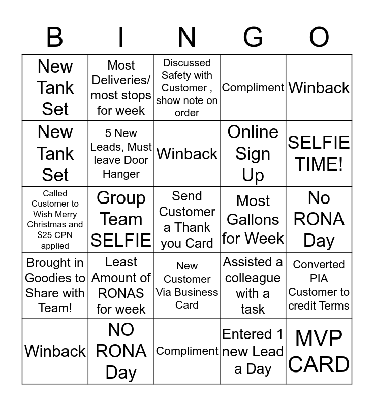 This bingo card has a free space and 24 words: Least Amount of RONAS for week, NO RONA Day, Winback, Winback, Winback, New Tank Set, New Tank Set, Most Deliveries/ most stops for week, Most Gallons for Week, New Customer Via Business Card, Online Sign Up, Called Customer to Wish Merry Christmas and $25 CPN applied, Assisted a colleague with a task, Converted PIA Customer to credit Terms, 5 New Leads, Must leave Door Hanger, Entered 1 new Lead a Day, No RONA Day, Discussed Safety with Customer , show note on order, SELFIE TIME!, Group Team SELFIE, MVP CARD, Brought in Goodies to Share with Team!, Compliment and Compliment.