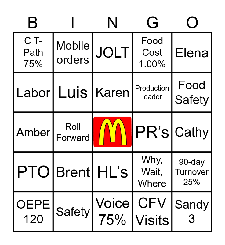 This bingo card has a free space and 81 words: BP Goals, Slack, JOLT, Shift Audits, e-production, Digital EAD%, Be Accurate, Top 5 Stat, Supporting Metrics, Profit Sharing, RGR, Shift Leader, Food Cost 1.00%, C T-Path 75%, Profit, Labor, Nicole, Brent, Santos, Cathy, Elvia, Elena, Amber, Karen, Luis, Kassy, Staffing, Crew Trainer, Communication Day, FRED, Food Safety, Zoom 75%, Voice 75%, Graded Visits 92%, OEPE 120, PR’s, Sandy 2, Ft Union, 20th East, Auto mall, Sandy 3, McBests, 1-800, Calibrations, Roll Forward, McDelivery, Mobile orders, LAST, Highly Satisfied, Gold Standard, Why, Wait, Where, 90-day Turnover 25%, OTP, Say Name, Hospitality, French Fry Quality, G.A.M.E, 100% on time, Sales, G.C.’s, HL’s, QL’s, PL’s, GM’s, B2B DT, R2P 100, Curbside, Harri, Digital Ambassador, People 1st, Cleanliness, PTO, Safety, Attendance raffle, Guest Counts, Delivery Star, Golden Squeegee, CFV Visits, PBS Visit, Production leader and Everything?.