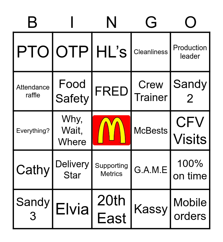This bingo card has a free space and 81 words: Sales, G.C.’s, HL’s, QL’s, PL’s, GM’s, B2B DT, R2P 100, Curbside, Harri, Digital Ambassador, People 1st, Cleanliness, PTO, Safety, Attendance raffle, Guest Counts, Delivery Star, Golden Squeegee, CFV Visits, PBS Visit, Production leader, Everything?, FRED, Food Safety, Zoom 75%, Voice 75%, Graded Visits 92%, OEPE 120, PR’s, Sandy 2, Ft Union, 20th East, Auto mall, Sandy 3, McBests, 1-800, Calibrations, Roll Forward, McDelivery, Mobile orders, LAST, Highly Satisfied, Gold Standard, Why, Wait, Where, 90-day Turnover 25%, OTP, Say Name, Hospitality, French Fry Quality, G.A.M.E, 100% on time, BP Goals, Slack, JOLT, Shift Audits, e-production, Digital EAD%, Be Accurate, Top 5 Stat, Supporting Metrics, Profit Sharing, RGR, Shift Leader, Food Cost 1.00%, C T-Path 75%, Profit, Labor, Nicole, Brent, Santos, Cathy, Elvia, Elena, Amber, Karen, Luis, Kassy, Staffing, Crew Trainer and Communication Day.