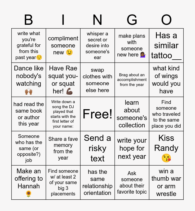 This bingo card has a free space and 24 words: Share a fave memory from the year, Find someone w/ at least 2 of your same big 3 placements, swap clothes with someone else here, Make an offering to Hannah ๐ป, Has a similar tattoo__, write what you're grateful for from this past year๐, Dance like nobody's watching๐๐พ, compliment someone new ๐, learn about someone's collection, Send a risky text, Brag about an accomplishment from the year, had read the same book or author this year, write your hope for next year, Kiss Randy๐, Have Rae squat you- or squat her! ๐ช๐ฟ, Ask someone about their favorite topic, Find someone who traveled to the same place you did, whisper a secret or desire into someone's ear, what kind of wings would you have, Write down a song the DJ played that starts with the first letter of your name:, win a thumb war or arm wrestle, Someone who has the same (or opposite?) job, make plans with someone new here ๐๐พโโ๏ธ and has the same relationship orientation.