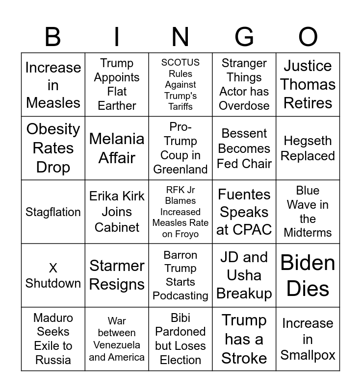 This bingo card has a free space and 24 words: Starmer Resigns, War between Venezuela and America, Pro-Trump Coup in Greenland, Maduro Seeks Exile to Russia, Justice Thomas Retires, Increase in Measles, Obesity Rates Drop, Trump Appoints Flat Earther, Fuentes Speaks at CPAC, Barron Trump Starts Podcasting, Bessent Becomes Fed Chair, Stagflation, JD and Usha Breakup, Biden Dies, Melania Affair, Trump has a Stroke, Blue Wave in the Midterms, SCOTUS Rules Against Trump's Tariffs, Hegseth Replaced, Erika Kirk Joins Cabinet, Increase in Smallpox, X Shutdown, Stranger Things Actor has Overdose and Bibi Pardoned but Loses Election.