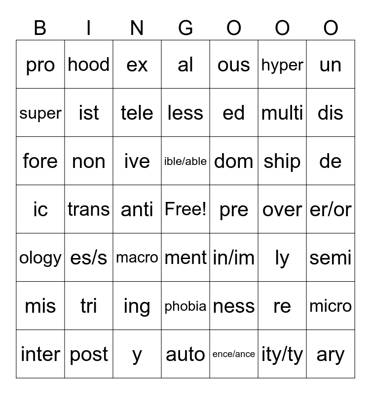 This bingo card has a free space and 48 words: ness, multi, auto, trans, ive, er/or, hood, post, hyper, ment, un, al, ship, dom, mis, over, super, dis, re, ous, ed, anti, pro, ist, micro, tele, de, inter, ible/able, non, ity/ty, pre, semi, tri, ic, in/im, ly, fore, macro, ing, ology, ary, ex, y, less, phobia, es/s and ence/ance.