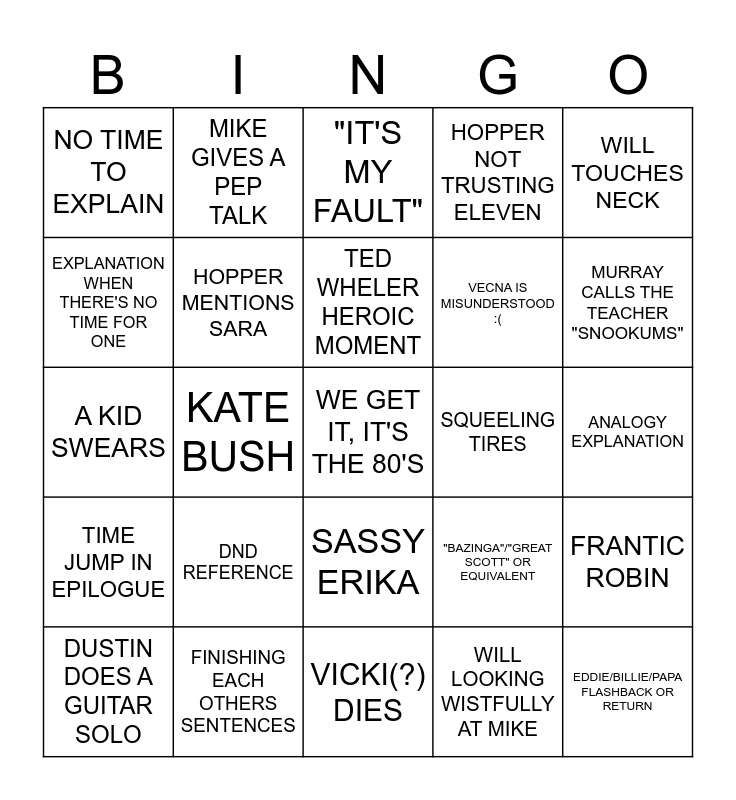 This bingo card has a free space and 24 words: DND REFERENCE, FINISHING EACH OTHERS SENTENCES, TED WHELER HEROIC MOMENT, DUSTIN DOES A GUITAR SOLO, WILL TOUCHES NECK, NO TIME TO EXPLAIN, EXPLANATION WHEN THERE'S NO TIME FOR ONE, MIKE GIVES A PEP TALK, SQUEELING TIRES, SASSY ERIKA, VECNA IS MISUNDERSTOOD :(, A KID SWEARS, "BAZINGA"/"GREAT SCOTT" OR EQUIVALENT, FRANTIC ROBIN, HOPPER MENTIONS SARA, WILL LOOKING WISTFULLY AT MIKE, ANALOGY EXPLANATION, "IT'S MY FAULT", MURRAY CALLS THE TEACHER "SNOOKUMS", KATE BUSH, EDDIE/BILLIE/PAPA FLASHBACK OR RETURN, TIME JUMP IN EPILOGUE, HOPPER NOT TRUSTING ELEVEN and VICKI(?) DIES.