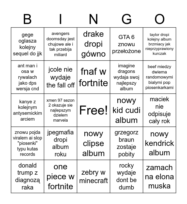This bingo card has a free space and 24 words: jpegmafia dropi album roku, one piece w fortnite, fnaf w fortnite, donald trump z diagnozą raka, taylor dropi kolejny album brzmiacy jak nieprzyprawiony kurczak, gege oglasza kolejny sequel do jjk, ant man i osa w rywalach jako dps wersja cnd, avengers doomsday jest chujowe ale i tak przebija miliard, nowy kid cudi album, nowy clipse album, imagine dragons wydaja swoj najlepszy album, kanye z kolejnym antysemickim arciem, grzegorz braun zostaje pobity, nowy kendrick album, jcole nie wydaje the fall off, rocky wydaje dont be dumb, maciek nie odpisuje cały rok, drake dropi gówno, beef miedzy dwiema randomowymi bialymi pop piosenkarkami, xmen 97 sezon 2 okazuje sie najlepszym dzielem marvela, zamach na elona muska, znowu pojda viralem ai slop "piosenki" typu kutas records, GTA 6 znowu przełożone and zebry w minecraft.