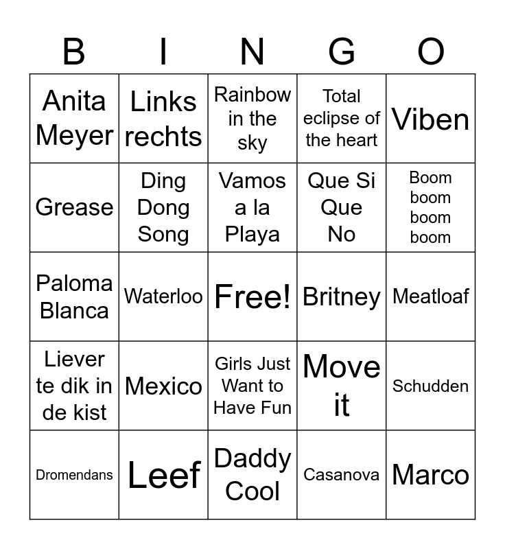 This bingo card has a free space and 45 words: Ich bin wie du, Marco, Linda Roos en Jessica, Dromendans, Dragostea Din Tei, Casanova, Rainbow in the sky, Captain Jack, Viben, Leef, Total eclipse of the heart, Britney, Girls Just Want to Have Fun, Mexico, Uptown Girl - Radio Edit, Daddy Cool, Funkytown, Paloma Blanca, Kinderen voor kinderen, Boom boom boom boom, Links rechts, Dolly Dots, 99 luftballons, Anita Meyer, Rampeneren, Meatloaf, Village people, Macarena, Move it, Liever te dik in de kist, Follow the leader, Schudden, Atje voor de sfeer, Take on me, Anton aus Tirol, Waterloo, Eye of the Tiger, Narcotic, La Bomba, Vamos a la Playa, Grease, Que Si Que No, Wake Me Up Before You Go-Go, Ding Dong Song and Fransje.