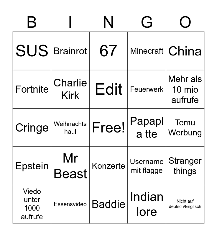 This bingo card has a free space and 24 words: Mr Beast, Essensvideo, Edit, Viedo unter 1000 aufrufe, China, SUS, Fortnite, Brainrot, Papapl a tte, Konzerte, Feuerwerk, Cringe, Username mit flagge, Stranger things, Charlie Kirk, Indian lore, Temu Werbung, 67, Mehr als 10 mio aufrufe, Weihnachts haul, Nicht auf deutsch/Englisch, Epstein, Minecraft and Baddie.