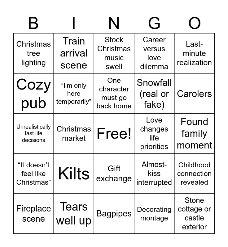 This bingo card has a free space and 46 words: Quaint Scottish village, Stone cottage or castle exterior, Rolling green hills, Bagpipes, Kilts, Scottish accent mentioned, Train arrival scene, Old family estate, Cozy pub, Foggy morning shot, “I’m only here temporarily”, Career versus love dilemma, Childhood connection revealed, Almost-kiss interrupted, Misunderstanding before the end, Big emotional confession, One character must go back home, Love changes life priorities, Happy ending kiss, Last-minute realization, Christmas market, Decorating montage, Christmas tree lighting, Snowfall (real or fake), Hot cocoa or mulled wine, Carolers, Fireplace scene, Christmas Eve celebration, Gift exchange, “It doesn’t feel like Christmas”, Estranged family members, Family tradition explained, Emotional reunion, Wise elder advice, Heartfelt speech, Tears well up, Found family moment, “This is where we belong”, Predictable plot twist, Overly cozy lighting, Perfectly timed snow, Stock Christmas music swell, Unrealistically fast life decisions, Small-town knows everyone, Holiday miracle and City versus small-town contrast.