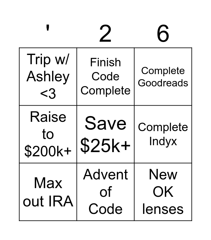 This bingo card has a free space and 8 words: Complete Indyx, Complete Goodreads, Finish Code Complete, Max out IRA, Trip w/ Ashley <3, New OK lenses, Raise to $200k+ and Advent of Code.
