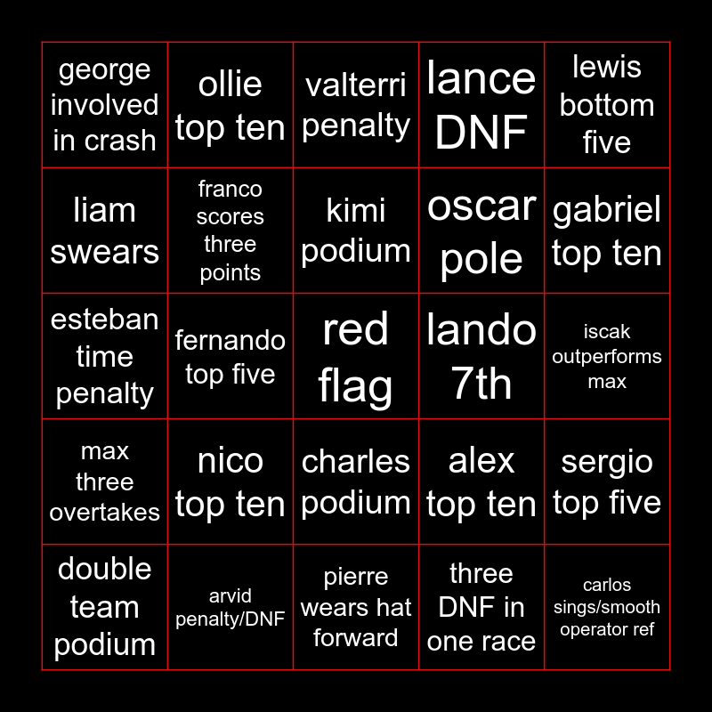 This bingo card has a free space and 24 words: nico top ten, arvid penalty/DNF, kimi podium, double team podium, lewis bottom five, george involved in crash, liam swears, ollie top ten, lando 7th, charles podium, oscar pole, esteban time penalty, alex top ten, sergio top five, franco scores three points, three DNF in one race, iscak outperforms max, valterri penalty, gabriel top ten, fernando top five, carlos sings/smooth operator ref, max three overtakes, lance DNF and pierre wears hat forward.