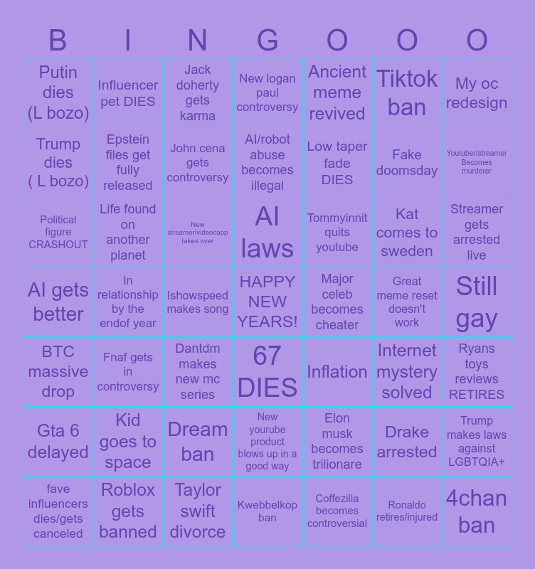 This bingo card has a free space and 48 words: BTC massive drop, In relationship by the endof year, Taylor swift divorce, 67 DIES, Low taper fade DIES, Great meme reset doesn't work, My oc redesign, fave influencers dies/gets canceled, Life found on another planet, Ishowspeed makes song, New logan paul controversy, Ancient meme revived, Kat comes to sweden, Streamer gets arrested live, AI gets better, Kid goes to space, Jack doherty gets karma, AI laws, Elon musk becomes trilionare, Tiktok ban, Youtuber/streamer Becomes murderer, Trump dies ( L bozo), Influencer pet DIES, John cena gets controversy, Coffezilla becomes controversial, Fake doomsday, Still gay, Gta 6 delayed, Fnaf gets in controversy, New streamer/videocapp takes over, New yourube product blows up in a good way, Tommyinnit quits youtube, Drake arrested, Trump makes laws against LGBTQIA+, Putin dies (L bozo), Roblox gets banned, Dantdm makes new mc series, Kwebbelkop ban, Major celeb becomes cheater, Ronaldo retires/injured, Ryans toys reviews RETIRES, Political figure CRASHOUT, Epstein files get fully released, Dream ban, AI/robot abuse becomes illegal, Inflation, Internet mystery solved and 4chan ban.
