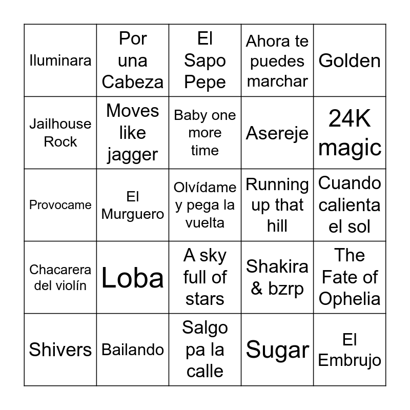 This bingo card has 25 words: Chacarera del violín, Bailando, Olvídame y pega la vuelta, Sugar, Golden, Iluminara, Por una Cabeza, El Sapo Pepe, Running up that hill, The Fate of Ophelia, Jailhouse Rock, Moves like jagger, Salgo pa la calle, Shakira & bzrp, 24K magic, Shivers, El Murguero, Baby one more time, Asereje, Cuando calienta el sol, Provocame, Loba, A sky full of stars, Ahora te puedes marchar and El Embrujo.