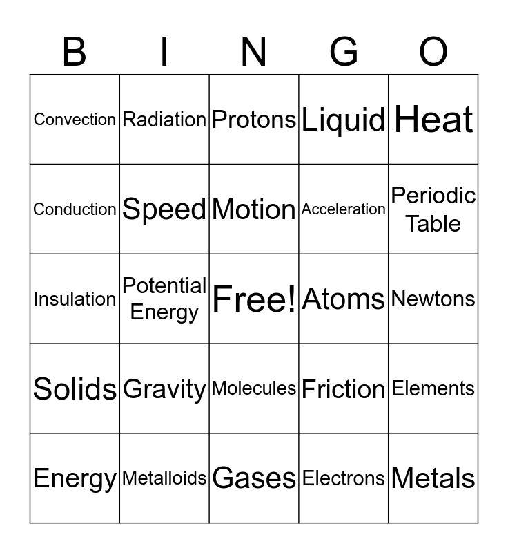 This bingo card has a free space and 24 words: Gravity, Metalloids, Motion, Energy, Heat, Convection, Conduction, Radiation, Atoms, Molecules, Acceleration, Insulation, Friction, Elements, Speed, Electrons, Newtons, Protons, Periodic Table, Potential Energy, Metals, Solids, Liquid and Gases.