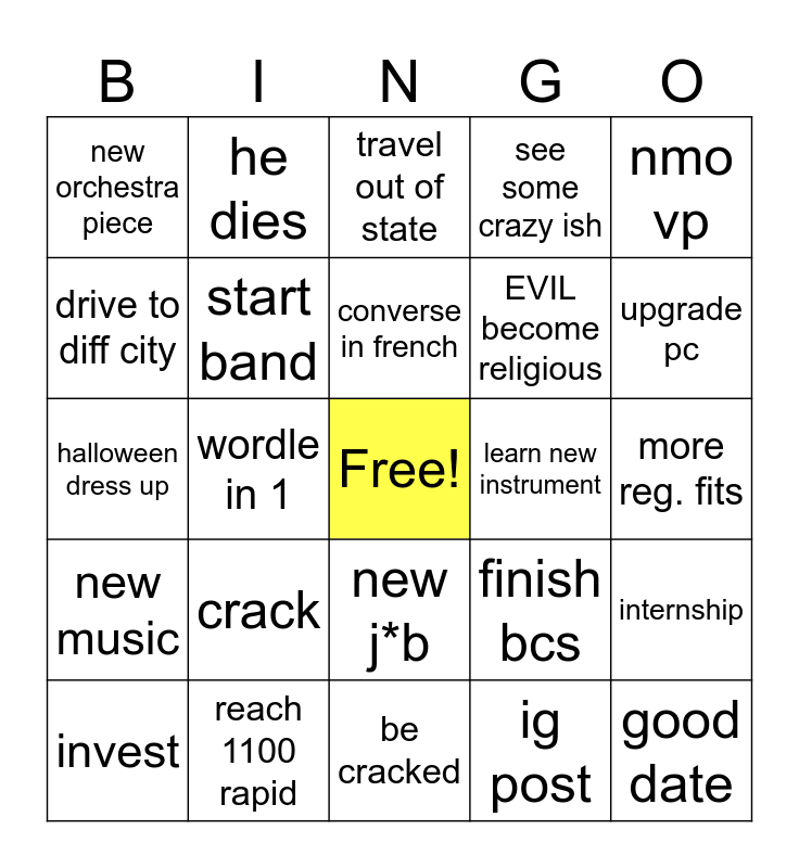 This bingo card has a free space and 24 words: crack, reach 1100 rapid, converse in french, invest, nmo vp, new orchestra piece, drive to diff city, he dies, learn new instrument, new j*b, EVIL become religious, halloween dress up, finish bcs, internship, start band, ig post, more reg. fits, travel out of state, upgrade pc, wordle in 1, good date, new music, see some crazy ish and be cracked.