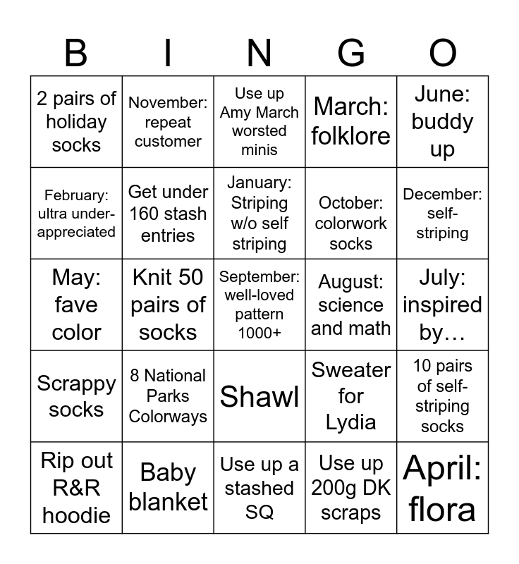 This bingo card has a free space and 24 words: 8 National Parks Colorways, Baby blanket, January: Striping w/o self striping, Rip out R&R hoodie, June: buddy up, 2 pairs of holiday socks, February: ultra under-appreciated, November: repeat customer, August: science and math, Shawl, October: colorwork socks, May: fave color, Sweater for Lydia, 10 pairs of self-striping socks, Get under 160 stash entries, Use up 200g DK scraps, July: inspired by…, Use up Amy March worsted minis, December: self-striping, Knit 50 pairs of socks, April: flora, Scrappy socks, March: folklore and Use up a stashed SQ.