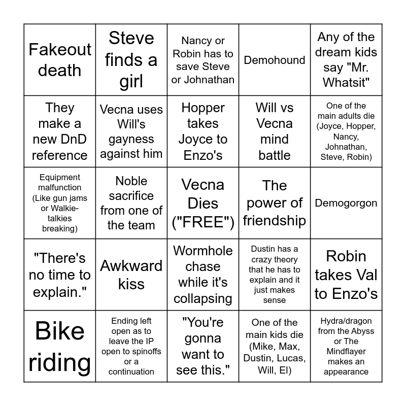 This bingo card has a free space and 29 words: Bike riding, Vecna having the chance to win, but decides to monologue, Noble sacrifice from one of the team, They actually play DnD again, Fakeout death, Nancy or Robin has to save Steve or Johnathan, Vecna uses Will's gayness against him, Awkward kiss, The power of friendship, Ending left open as to leave the IP open to spinoffs or a continuation, Demogorgon, Hydra/dragon from the Abyss or The Mindflayer makes an appearance, "You're gonna want to see this.", One of the main kids die (Mike, Max, Dustin, Lucas, Will, El), One of the main adults die (Joyce, Hopper, Nancy, Johnathan, Steve, Robin), Government being more in the way than helpful, Wormhole chase while it's collapsing, "There's no time to explain.", Any of the dream kids say "Mr. Whatsit", Equipment malfunction (Like gun jams or Walkie-talkies breaking), Dustin has a crazy theory that he has to explain and it just makes sense, Kali turns out to be evil, Will vs Vecna mind battle, They make a new DnD reference, Demohound, Steve finds a girl, Robin takes Val to Enzo's, Hopper takes Joyce to Enzo's and Kali tires to keep El in the wormhole as it closes.