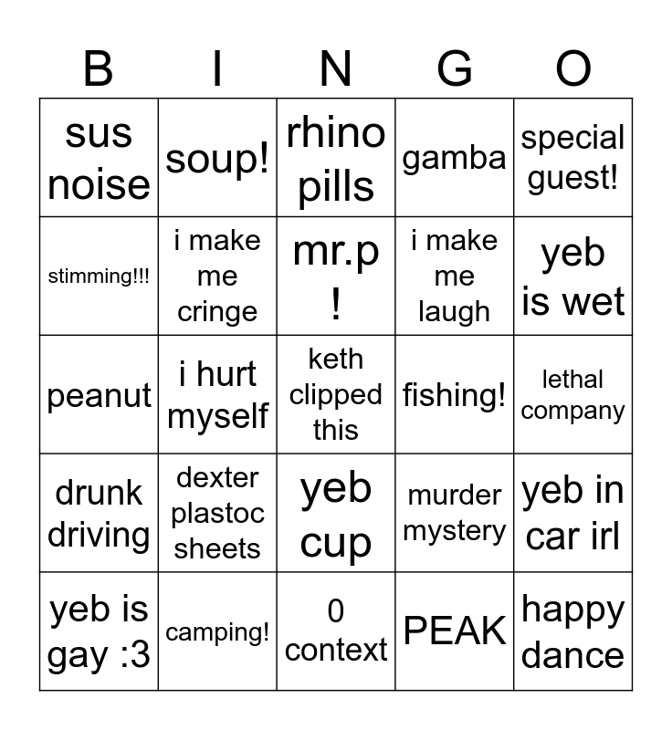 This bingo card has a free space and 24 words: dexter plastoc sheets, camping!, mr.p !, yeb is gay :3, special guest!, sus noise, stimming!!!, soup!, fishing!, yeb cup, i make me laugh, peanut, murder mystery, yeb in car irl, i make me cringe, PEAK, lethal company, rhino pills, yeb is wet, i hurt myself, happy dance, drunk driving, gamba and 0 context.
