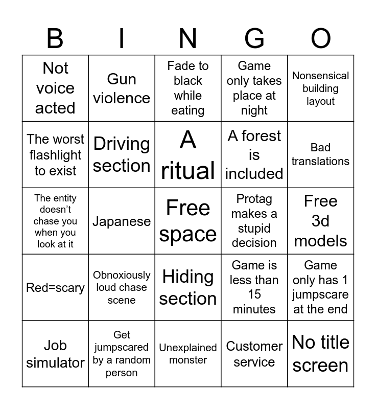 This bingo card has a free space and 29 words: Job simulator, Serial killer on the loose, Japanese, Low poly graphics, Not voice acted, Fade to black while eating, Driving section, Obnoxiously loud chase scene, Protag makes a stupid decision, Get jumpscared by a random person, Free 3d models, No title screen, Unexplained monster, Customer service, Bad translations, Go to a gas station, Hiding section, Red=scary, Nonsensical building layout, The entity doesn’t chase you when you look at it, Game is less than 15 minutes, Anomaly spotting, A forest is included, The worst flashlight to exist, Game only takes place at night, Gun violence, Game only has 1 jumpscare at the end, A ritual and Abandoned building.