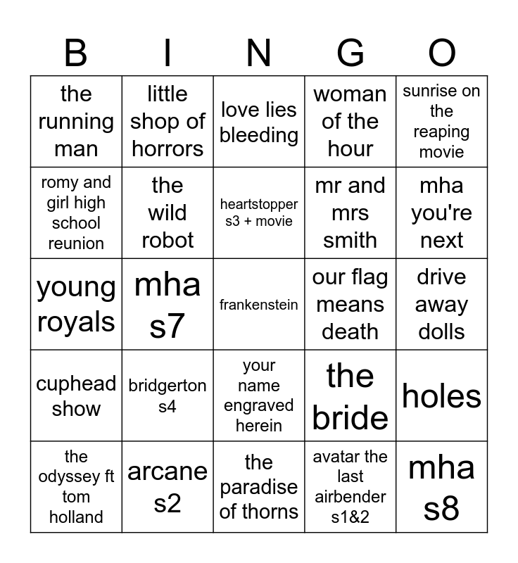 This bingo card has a free space and 24 words: bridgerton s4, arcane s2, heartstopper s3 + movie, the odyssey ft tom holland, sunrise on the reaping movie, the running man, romy and girl high school reunion, little shop of horrors, our flag means death, your name engraved herein, mr and mrs smith, young royals, the bride, holes, the wild robot, avatar the last airbender s1&2, drive away dolls, love lies bleeding, mha you're next, mha s7, mha s8, cuphead show, woman of the hour and the paradise of thorns.