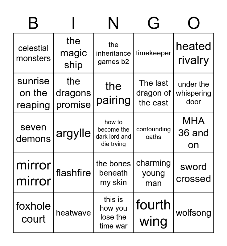 This bingo card has a free space and 24 words: flashfire, heatwave, the pairing, foxhole court, heated rivalry, celestial monsters, sunrise on the reaping, the magic ship, confounding oaths, the bones beneath my skin, The last dragon of the east, seven demons, charming young man, sword crossed, the dragons promise, fourth wing, MHA 36 and on, the inheritance games b2, under the whispering door, argylle, wolfsong, mirror mirror, timekeeper and this is how you lose the time war.