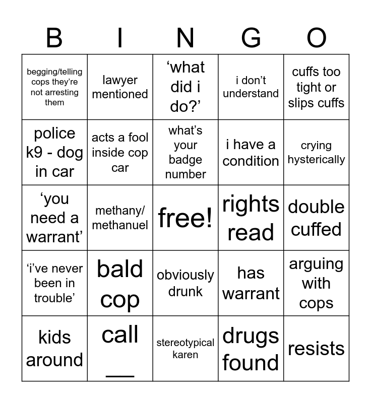 This bingo card has a free space and 29 words: kids around, florida, methany/ methanuel, assaults cop, begging/telling cops they’re not arresting them, ‘what did i do?’, acts a fool inside cop car, bald cop, rights read, call __, double cuffed, resists, stereotypical karen, drugs found, crying hysterically, in parking lot, obviously drunk, ‘i’ve never been in trouble’, cuffs too tight or slips cuffs, ‘you need a warrant’, has warrant, repeat offender, i have a condition, police k9 - dog in car, i don’t understand, lawyer mentioned, arguing with cops, what’s your badge number and dweeb cop.