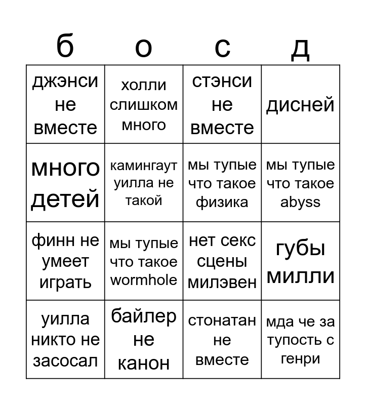 This bingo card has 16 words: байлер не канон, губы милли, стэнси не вместе, джэнси не вместе, финн не умеет играть, холли слишком много, нет секс сцены милэвен, стонатан не вместе, много детей, камингаут уилла не такой, уилла никто не засосал, дисней, мы тупые что такое wormhole, мы тупые что такое abyss, мы тупые что такое физика and мда че за тупость с генри.