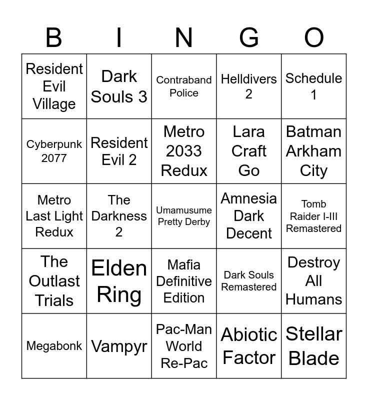 This bingo card has a free space and 24 words: Elden Ring, Vampyr, Metro 2033 Redux, Megabonk, Schedule 1, Resident Evil Village, Cyberpunk 2077, Dark Souls 3, Amnesia Dark Decent, Mafia Definitive Edition, Lara Craft Go, Metro Last Light Redux, Dark Souls Remastered, Destroy All Humans, Resident Evil 2, Abiotic Factor, Tomb Raider I-III Remastered, Contraband Police, Batman Arkham City, The Darkness 2, Stellar Blade, The Outlast Trials, Helldivers 2 and Pac-Man World Re-Pac.