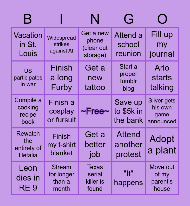 This bingo card has a free space and 24 words: Finish my t-shirt blanket, Stream for longer than a month, Get a new tattoo, Leon dies in RE 9, Fill up my journal, Vacation in St. Louis, US participates in war, Widespread strikes against AI, Save up to $5k in the bank, Get a better job, Start a proper tumblr blog, Compile a cooking recipe book, Attend another protest, Adopt a plant, Finish a long Furby, "It" happens, Silver gets his own game announced, Get a new phone (clear out storage), Arlo starts talking, Finish a cosplay or fursuit, Move out of my parent's house, Rewatch the entirety of Hetalia, Attend a school reunion and Texas serial killer is found.