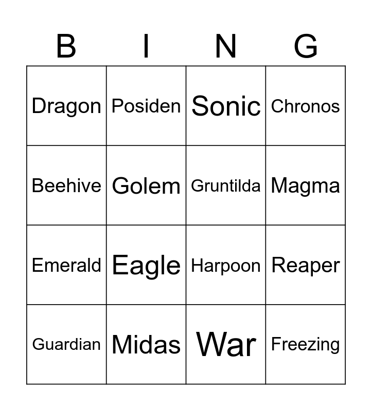 This bingo card has 16 words: Midas, Reaper, Sonic, Dragon, Emerald, Posiden, Harpoon, War, Beehive, Golem, Guardian, Chronos, Eagle, Magma, Gruntilda and Freezing.
