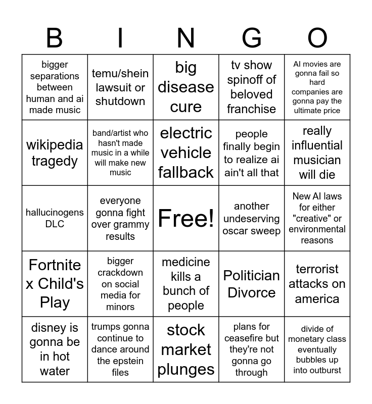 This bingo card has a free space and 24 words: bigger crackdown on social media for minors, trumps gonna continue to dance around the epstein files, electric vehicle fallback, disney is gonna be in hot water, AI movies are gonna fail so hard companies are gonna pay the ultimate price, bigger separations between human and ai made music, wikipedia tragedy, temu/shein lawsuit or shutdown, another undeserving oscar sweep, medicine kills a bunch of people, people finally begin to realize ai ain't all that, hallucinogens DLC, Politician Divorce, terrorist attacks on america, band/artist who hasn't made music in a while will make new music, plans for ceasefire but they're not gonna go through, New AI laws for either "creative" or environmental reasons, big disease cure, really influential musician will die, everyone gonna fight over grammy results, divide of monetary class eventually bubbles up into outburst, Fortnite x Child's Play, tv show spinoff of beloved franchise and stock market plunges.