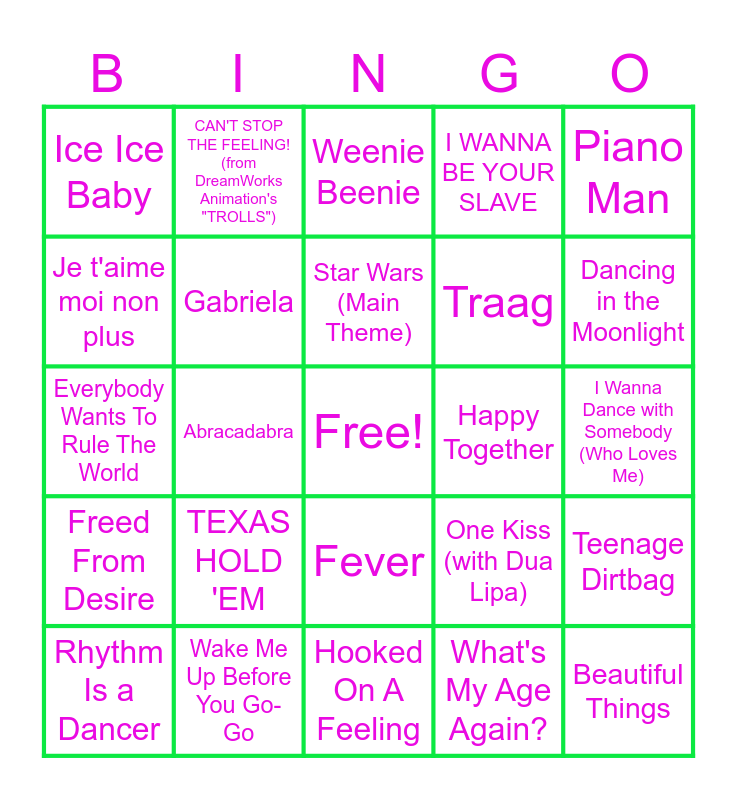 This bingo card has a free space and 26 words: Fever, What's My Age Again?, Star Wars (Main Theme), Wake Me Up Before You Go-Go, Piano Man, Ice Ice Baby, Je t'aime moi non plus, CAN'T STOP THE FEELING! (from DreamWorks Animation's "TROLLS"), I Wanna Dance with Somebody (Who Loves Me), One Kiss (with Dua Lipa), Traag, Everybody Wants To Rule The World, Teenage Dirtbag, Rhythm Is a Dancer, Abracadabra, De Stad Is Van Ons, I WANNA BE YOUR SLAVE, Freed From Desire, Weenie Beenie, Beautiful Things, Dancing in the Moonlight, Hooked On A Feeling, Happy Together, TEXAS HOLD 'EM, Gabriela and Holiday Rap.