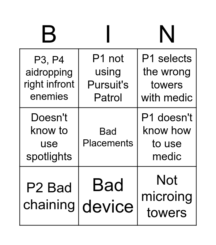 This bingo card has a free space and 8 words: P1 doesn't know how to use medic, P1 selects the wrong towers with medic, P1 not using Pursuit's Patrol, P2 Bad chaining, P3, P4 aidropping right infront enemies, Not microing towers, Doesn't know to use spotlights and Bad device.