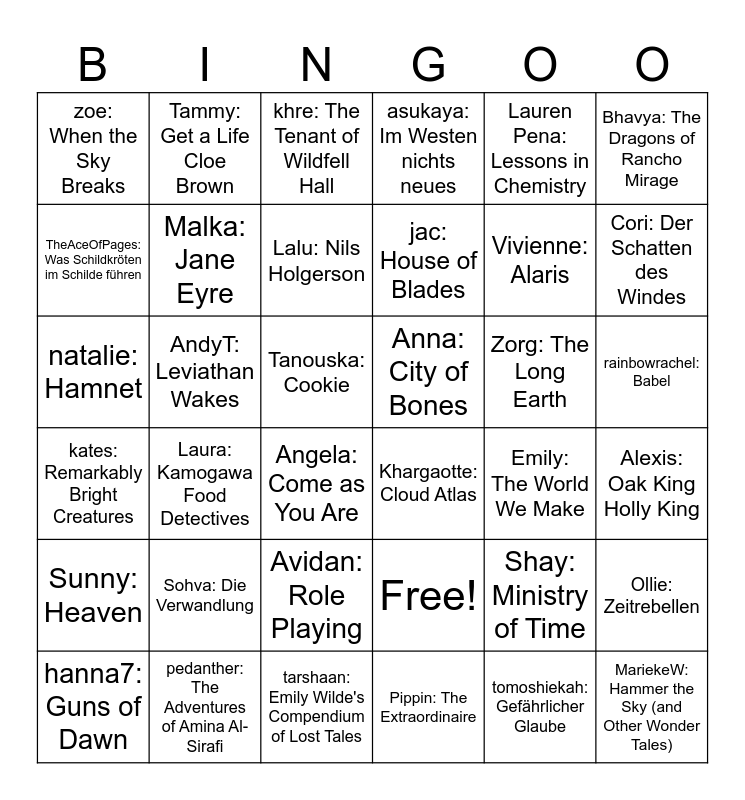 This bingo card has 36 words: Free!, Avidan: Role Playing, Pippin: The Extraordinaire, TheAceOfPages: Was Schildkröten im Schilde führen, kates: Remarkably Bright Creatures, Anna: City of Bones, Malka: Jane Eyre, tarshaan: Emily Wilde's Compendium of Lost Tales, Lauren Pena: Lessons in Chemistry, Shay: Ministry of Time, Cori: Der Schatten des Windes, asukaya: Im Westen nichts neues, Ollie: Zeitrebellen, AndyT: Leviathan Wakes, jac: House of Blades, zoe: When the Sky Breaks, Sunny: Heaven, Zorg: The Long Earth, natalie: Hamnet, khre: The Tenant of Wildfell Hall, Tanouska: Cookie, Laura: Kamogawa Food Detectives, Khargaotte: Cloud Atlas, Angela: Come as You Are, Emily: The World We Make, Tammy: Get a Life Cloe Brown, Vivienne: Alaris, pedanther: The Adventures of Amina Al-Sirafi, Lalu: Nils Holgerson, Bhavya: The Dragons of Rancho Mirage, MariekeW: Hammer the Sky (and Other Wonder Tales), hanna7: Guns of Dawn, Alexis: Oak King Holly King, rainbowrachel: Babel, Sohva: Die Verwandlung and tomoshiekah: Gefährlicher Glaube.