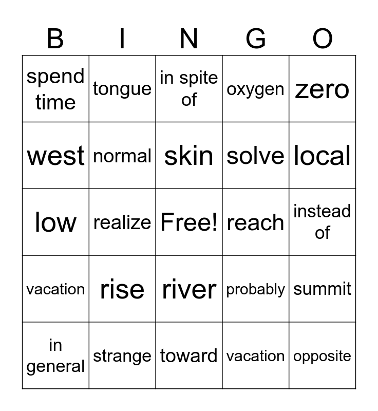 This bingo card has a free space and 29 words: in general, museum, realize, set, spend time, in spite of, normal, rise, reach, strange, instead of, opposite, toward, vacation, local, predict, river, vacation, zero, low, probably, season, solve, west, oxygen, tongue, summit, skin and slip.