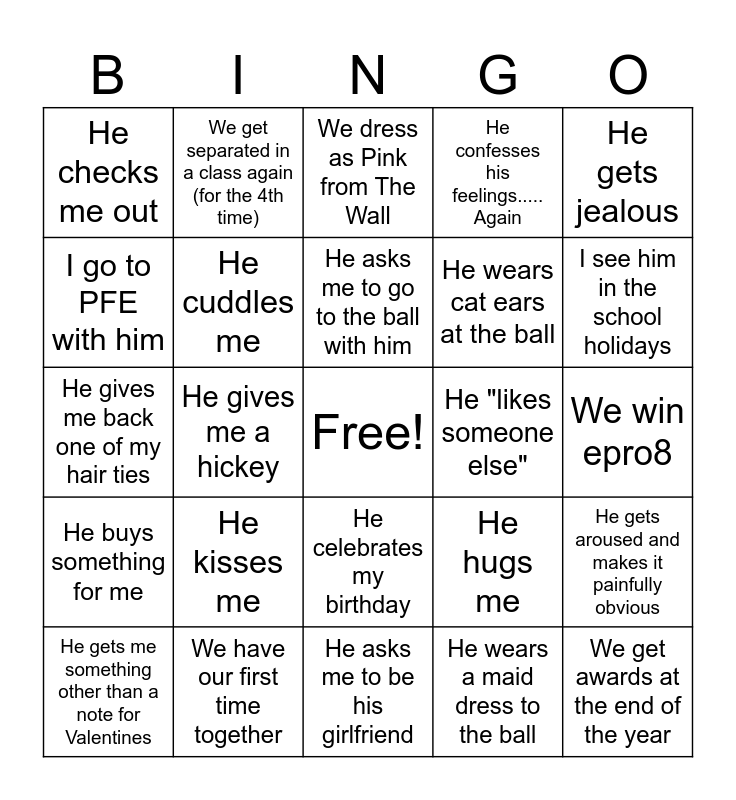 This bingo card has a free space and 24 words: He kisses me, We have our first time together, He asks me to go to the ball with him, He gets me something other than a note for Valentines, He gets jealous, He checks me out, I go to PFE with him, We get separated in a class again (for the 4th time), He "likes someone else", He celebrates my birthday, He wears cat ears at the ball, He gives me back one of my hair ties, He hugs me, He gets aroused and makes it painfully obvious, He cuddles me, He wears a maid dress to the ball, We win epro8, We dress as Pink from The Wall, I see him in the school holidays, He gives me a hickey, We get awards at the end of the year, He buys something for me, He confesses his feelings..... Again and He asks me to be his girlfriend.
