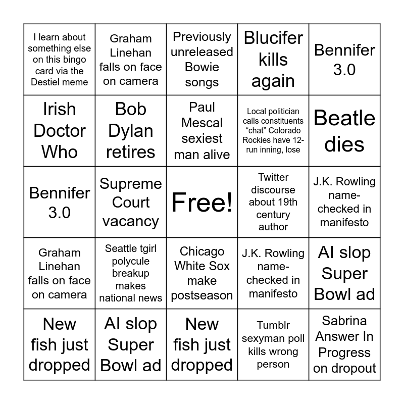 This bingo card has a free space and 46 words: Local politician calls constituents “chat” Colorado Rockies have 12-run inning, lose, Sabrina Answer In Progress on dropout, Beatle dies, New fish just dropped, Seattle tgirl polycule breakup makes national news, Chicago White Sox make postseason, Graham Linehan falls on face on camera, Wicked wins undeserved Oscar, Irish Doctor Who, Openly gay MLB player, Bob Dylan retires, Blucifer kills again, AI slop Super Bowl ad, J.K. Rowling name-checked in manifesto, Fairy/Ground Pokemon ruins VGC, Technology Connections trans, Paul Mescal sexiest man alive, Twitter discourse about 19th century author, Previously unreleased Bowie songs, Bennifer 3.0, Supreme Court vacancy, Tumblr sexyman poll kills wrong person, I learn about something else on this bingo card via the Destiel meme, Local politician calls constituents “chat” Colorado Rockies have 12-run inning, lose, Sabrina Answer In Progress on dropout, Beatle dies, New fish just dropped, Seattle tgirl polycule breakup makes national news, Chicago White Sox make postseason, Graham Linehan falls on face on camera, Wicked wins undeserved Oscar, Irish Doctor Who, Openly gay MLB player, Bob Dylan retires, Blucifer kills again, AI slop Super Bowl ad, J.K. Rowling name-checked in manifesto, Fairy/Ground Pokemon ruins VGC, Technology Connections trans, Paul Mescal sexiest man alive, Twitter discourse about 19th century author, Previously unreleased Bowie songs, Bennifer 3.0, Supreme Court vacancy, Tumblr sexyman poll kills wrong person and I learn about something else on this bingo card via the Destiel meme.