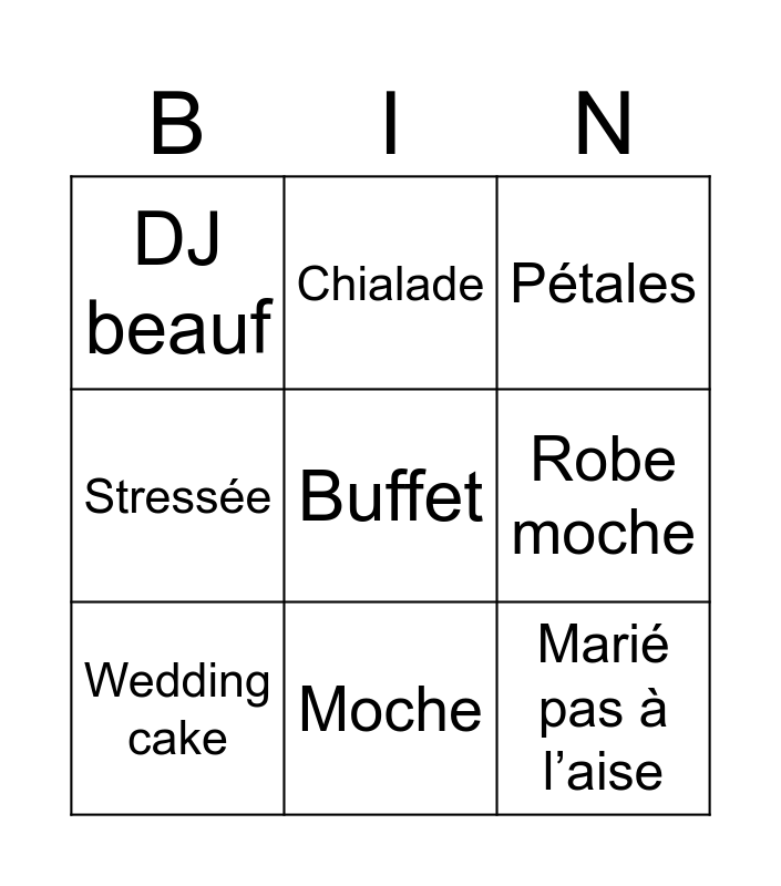 This bingo card has a free space and 8 words: Robe moche, Pétales, Chialade, Wedding cake, DJ beauf, Marié pas à l’aise, Stressée and Moche.