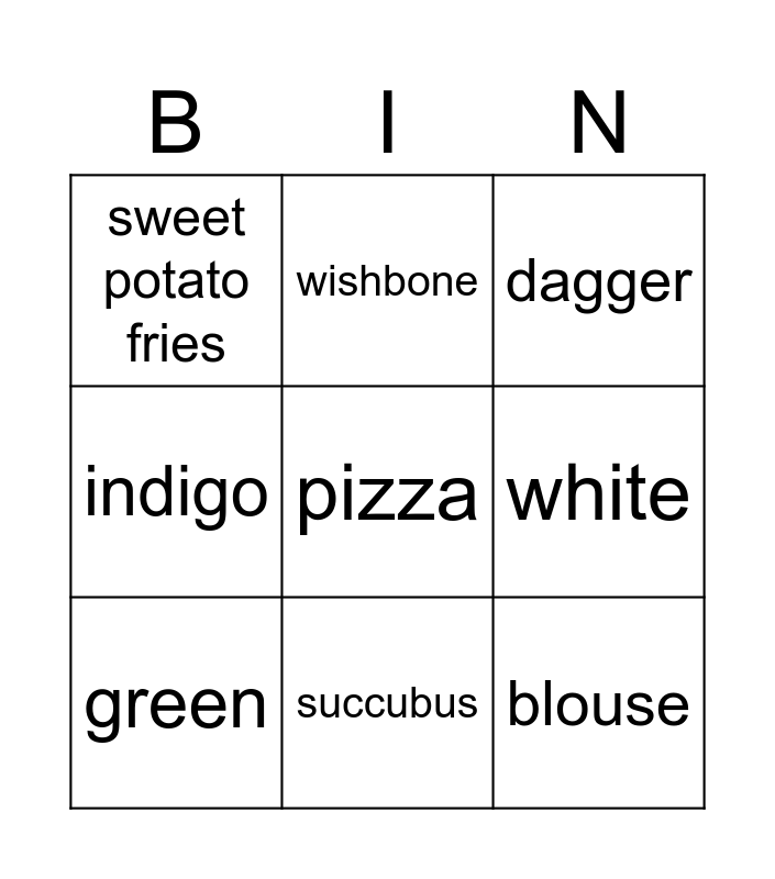 This bingo card has a free space and 8 words: white, dagger, wishbone, green, sweet potato fries, blouse, indigo and succubus.