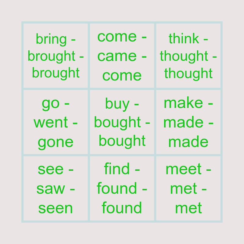 This bingo card has 15 words: catch - caught - caught, teach - taught - taught, think - thought - thought, bring - brought - brought, find - found - found, buy - bought - bought, fight - fought - fought, do - did - done, make - made - made, meet - met - met, get - got - got, go - went - gone, see - saw - seen, come - came - come and have - had - had.