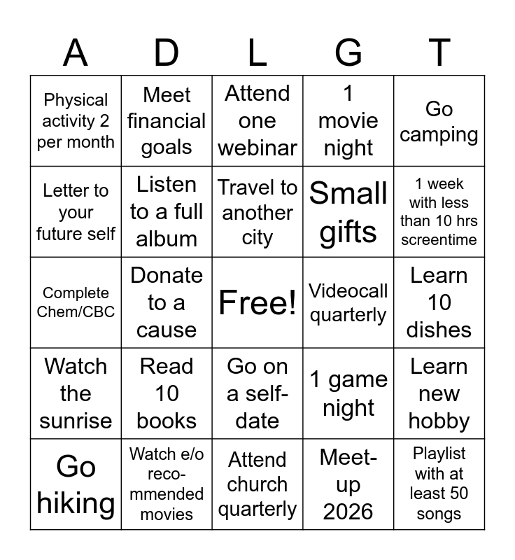 This bingo card has a free space and 24 words: Go hiking, Read 10 books, Travel to another city, Meet-up 2026, Go camping, Physical activity 2 per month, Meet financial goals, Attend one webinar, Videocall quarterly, Learn 10 dishes, Complete Chem/CBC, Listen to a full album, 1 game night, Learn new hobby, Letter to your future self, Watch e/o reco-mmended movies, Attend church quarterly, 1 movie night, 1 week with less than 10 hrs screentime, Watch the sunrise, Donate to a cause, Go on a self-date, Small gifts and Playlist with at least 50 songs.