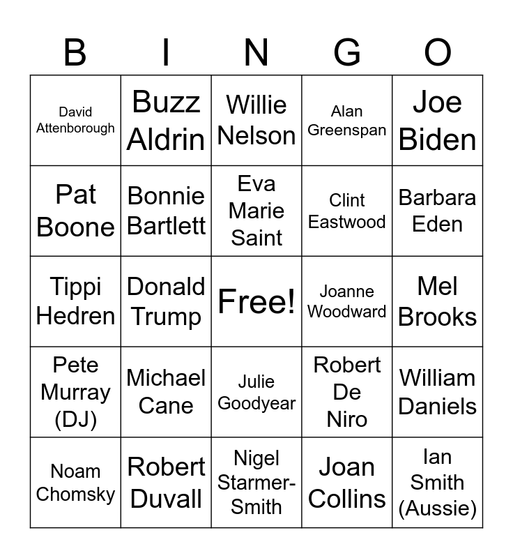 This bingo card has a free space and 24 words: Michael Cane, Robert Duvall, Eva Marie Saint, Noam Chomsky, Joe Biden, David Attenborough, Pat Boone, Buzz Aldrin, Joanne Woodward, Julie Goodyear, Clint Eastwood, Tippi Hedren, Robert De Niro, William Daniels, Bonnie Bartlett, Joan Collins, Mel Brooks, Willie Nelson, Barbara Eden, Donald Trump, Ian Smith (Aussie), Pete Murray (DJ), Alan Greenspan and Nigel Starmer-Smith.