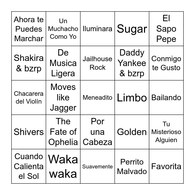 This bingo card has 25 words: Shivers, Waka waka, Meneadito, Perrito Malvado, El Sapo Pepe, Ahora te Puedes Marchar, Un Muchacho Como Yo, Iluminara, Limbo, Tu Misterioso Alguien, Shakira & bzrp, De Musica Ligera, Suavemente, Golden, Conmigo te Gusto, Cuando Calienta el Sol, Moves like Jagger, Jailhouse Rock, Daddy Yankee & bzrp, Bailando, Chacarera del Violín, The Fate of Ophelia, Por una Cabeza, Sugar and Favorita.