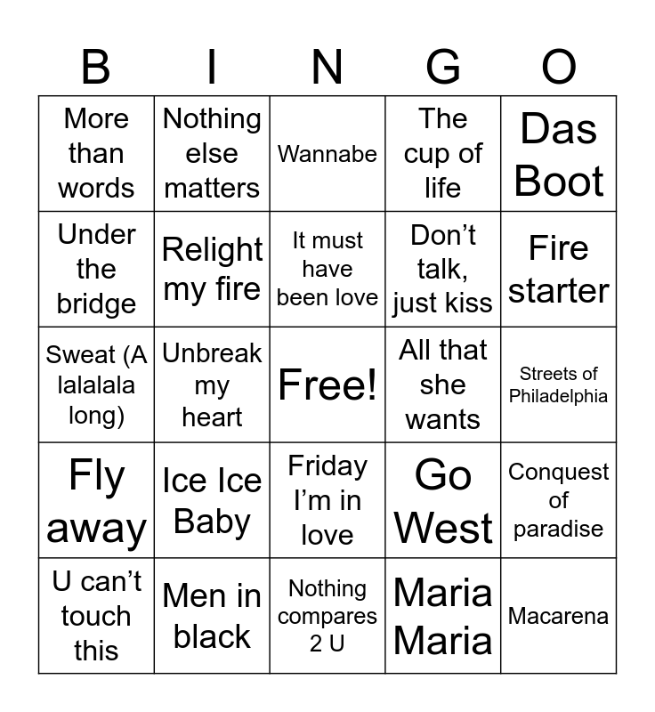 This bingo card has a free space and 25 words: Ice Ice Baby, Nothing compares 2 U, It must have been love, U can’t touch this, Das Boot, More than words, Under the bridge, Nothing else matters, All that she wants, Friday I’m in love, Don’t talk, just kiss, Sweat (A lalalala long), Go West, Conquest of paradise, Relight my fire, Self esteem, Streets of Philadelphia, Wannabe, Fire starter, Unbreak my heart, Macarena, Men in black, Fly away, The cup of life and Maria Maria.