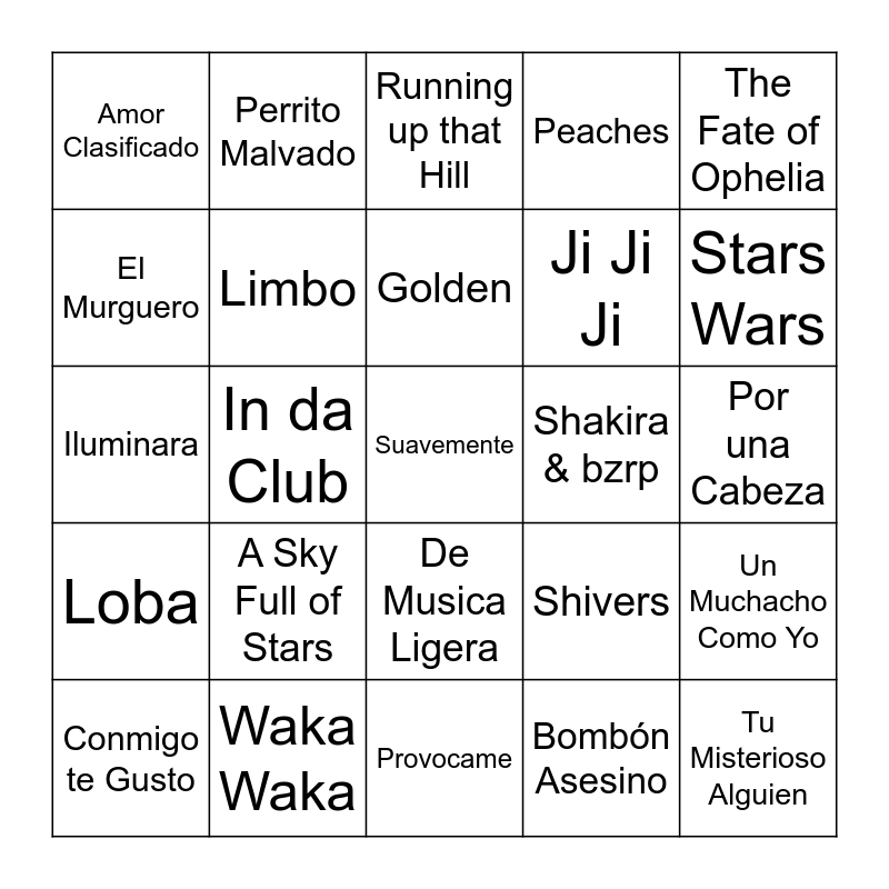 This bingo card has 25 words: Loba, Waka Waka, Suavemente, Bombón Asesino, The Fate of Ophelia, Amor Clasificado, Perrito Malvado, Running up that Hill, Shakira & bzrp, Un Muchacho Como Yo, El Murguero, Limbo, Provocame, Shivers, Stars Wars, Conmigo te Gusto, In da Club, Golden, Ji Ji Ji, Por una Cabeza, Iluminara, A Sky Full of Stars, De Musica Ligera, Peaches and Tu Misterioso Alguien.