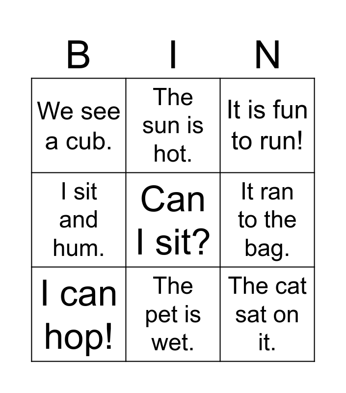 This bingo card has 12 words: Free!, The cat sat on it., Can I sit?, It ran to the bag., The sun is hot., It is fun to run!, The pet is wet., The hen is red., We see a cub., I sit and hum., I can hop! and I had a big cat..