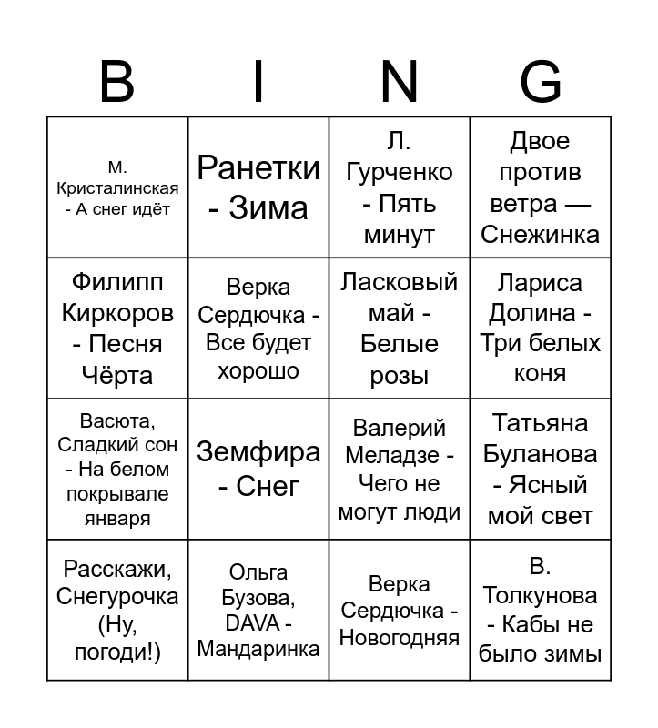 This bingo card has 56 words: Free!, Ой, мороз, мороз!, Dailey & Vincent - Mr. Grinch, М. Кристалинская - А снег идёт, А. Резникова - Новогодние игрушки, ВИА «Верасы» - Завируха, Ласковый май - Белые розы, Унесённые ветром - Давай наливай, Васюта, Сладкий сон - На белом покрывале января, Ella Fitzgerald - Have Yourself A Merry Little Christmas, Двое против ветра — Снежинка, А. Кортнев - Бубенцы, ВИА «Добры молодцы» - Песня о снежинке, Л. Сенчина - Лесной олень, В лесу родилась ёлочка, Филипп Киркоров - Снег, Филипп Киркоров - Песня Чёрта, Татьяна Буланова - Ясный мой свет, Стекловата - Новый год, Расскажи, Снегурочка (Ну, погоди!), Ольга Бузова, DAVA - Мандаринка, Н. Бродская - Звенит январская вьюга, Маленькой ёлочке холодно зимой, Л. Гурченко - Пять минут, Лолита - Я люблю себя (из м. Золушка), Лариса Долина - Три белых коня, А. Пугачёва, К. Орбакайте - Опять метель, Игорь Николаев - Выпьем за любовь, Земфира - Снег, Дискотека Авария - Новогодняя, Глюк'oZa - Снег идёт, ВИА Пламя - Снег кружится, ВИА ГРА - Я не поняла!, Верка Сердючка - Ёлки, Верка Сердючка - Новогодняя, Верка Сердючка - Все будет хорошо, Валерий Меладзе - Чего не могут люди, Валерий Меладзе - Старый год, В. Толкунова - Кабы не было зимы, Ранетки - Зима, Блестящие - Новогодняя песня, Эдуард Хиль - Зима, Андрей Губин - Зима-холода, Алсу - Зимний сон, Аида Ведищева - Песенка о медведях, ZOLOTO - Вот и всё, Michael Bublé - White Christmas, Wham! - Last Christmas, Brenda Lee - Rockin' Around The Christmas Tree, Mariah Carey - All I Want For Christmas Is You, Bing Crosby - Its Beginning To Look Like Christmas, Richard Tomas - Its the Most Wonderful Time of the Year, FEDUK - Хлопья летят наверх, Dean Martin - Let It Snow, Let It Snow, Let It Snow, Coca-Cola - Праздник к нам приходит! and ABBA - Happy New Year.